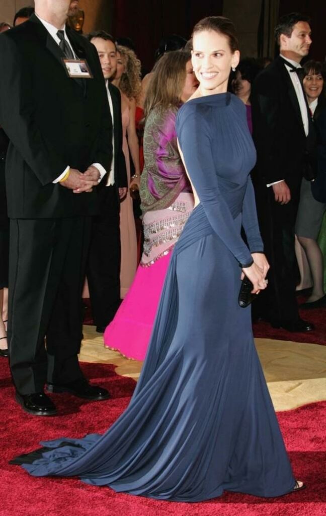 Ένα πολύ πρωτότυπο μαξι φόρεμα σε σκούρο μπλε, το οποίο από μπροστά ήταν κλειστό μέχρι το λαιμό με μακριά μανίκια ενώ από πίσω όλη η πλάτη και μέρος της λεκάνης ήταν εκτεθειμένα. Η τέλεια επιλογή για μια εντυπωσιακή εμφάνιση 360 μοιρών μιας και η Swank σηκώθηκε να παραλάβει το Όσκαρ Α’ γυναικείου ρόλου για την ταινία “Million Dollar Baby”. Εξώπλατα σκούρα μπλε φορέματα μπορείτε να βρείτε εδώ κι εδώ