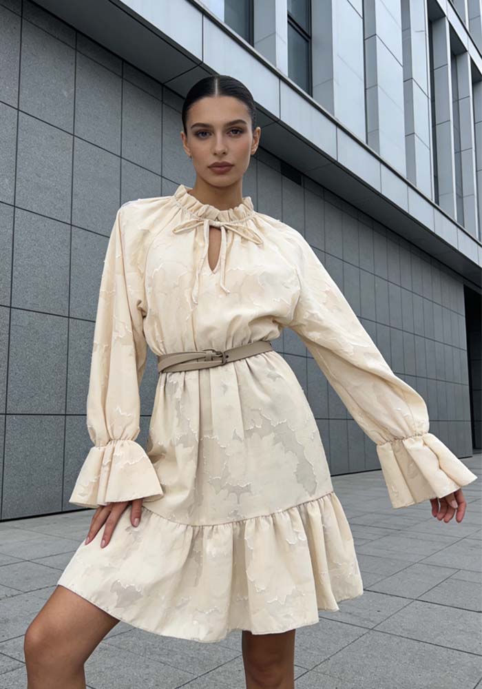 Κομψό και statement, το mini φόρεμα Devoré σε μπεζ απόχρωση, συνδυάζει ανάγλυφη υφή και αέρινη κίνηση με πρακτική εφαρμογή. Το devoré ύφασμα χαρίζει πολυτελές αποτέλεσμα και διακριτική διαφάνεια στο επάνω μέρος, ενώ το φόρεμα είναι φοδραρισμένο από τη μέση και κάτω, εξασφαλίζοντας άνεση και κάλυψη. Η ελαστική μέση με λάστιχο προσφέρει τέλεια εφαρμογή σε διαφορετικούς σωματότυπους, ενώ η ζώνη από δερματίνη τονίζει τη σιλουέτα και προσθέτει μοντέρνα αισθητική ισορροπία. Τα βολάν στο τελείωμα ολοκληρώνουν το look με ρομαντική κίνηση και θηλυκό χαρακτήρα. Ιδανική επιλογή για city chic εμφανίσεις, brunch looks, καλοκαιρινά events και day-to-night styling.