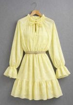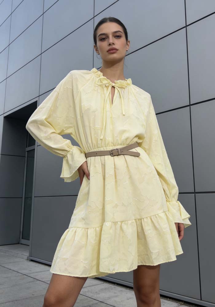Κομψό και statement, το mini φόρεμα Devoré σε κίτρινο παστέλ, συνδυάζει ανάγλυφη υφή και αέρινη κίνηση με πρακτική εφαρμογή. Το devoré ύφασμα χαρίζει πολυτελές αποτέλεσμα και διακριτική διαφάνεια στο επάνω μέρος, ενώ το φόρεμα είναι φοδραρισμένο από τη μέση και κάτω, εξασφαλίζοντας άνεση και κάλυψη. Η ελαστική μέση με λάστιχο προσφέρει τέλεια εφαρμογή σε διαφορετικούς σωματότυπους, ενώ η ζώνη από δερματίνη τονίζει τη σιλουέτα και προσθέτει μοντέρνα αισθητική ισορροπία. Τα βολάν στο τελείωμα ολοκληρώνουν το look με ρομαντική κίνηση και θηλυκό χαρακτήρα. Ιδανική επιλογή για city chic εμφανίσεις, brunch looks, καλοκαιρινά events και day-to-night styling.