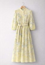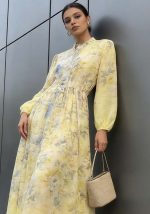 Αέρινο φόρεμα Voille από βαμβακερό βουάλ ύφασμα σε απαλή κίτρινη βάση με διακριτικό floral print σε γαλάζιες και muted αποχρώσεις, σχεδιασμένο για κομψές και ρομαντικές εμφανίσεις. Η γραμμή του είναι θηλυκή και ισορροπημένη, με ελαφρύ όγκο στα μανίκια και με λαστιχάκι στη μέση για άνεση, που αναδεικνύει τη σιλουέτα χωρίς να περιορίζει την κίνηση. Το μπροστινό κλείσιμο με κουμπιά και ο όρθιος γιακάς προσθέτουν refined αισθητική, ενώ η πλεκτή ζώνη σε φυσική απόχρωση δημιουργεί αντίθεση και προσφέρει ευελιξία στο styling. Το φόρεμα είναι φοδραρισμένο στο κάτω μέρος. Ιδανικό για: Office, βαπτίσεις, daytime events καιsmart casual εμφανίσεις.
