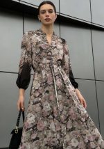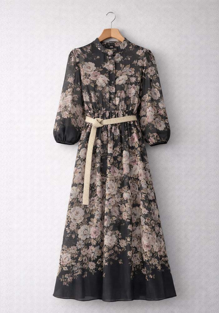 Αέρινο φόρεμα Voille από βαμβακερό βουάλ ύφασμα σε μαύρη βάση με διακριτικό floral print σε γήινες αποχρώσεις ροζ, μπεζ και muted taupe, σχεδιασμένο για κομψές και ρομαντικές εμφανίσεις. Η γραμμή του είναι θηλυκή και ισορροπημένη, με ελαφρύ όγκο στα μανίκια και με λαστιχάκι στη μέση για άνεση, που αναδεικνύει τη σιλουέτα χωρίς να περιορίζει την κίνηση. Το μπροστινό κλείσιμο με κουμπιά και ο όρθιος γιακάς προσθέτουν refined αισθητική, ενώ η πλεκτή ζώνη σε φυσική απόχρωση δημιουργεί αντίθεση και προσφέρει ευελιξία στο styling. Το φόρεμα είναι φοδραρισμένο στο κάτω μέρος. Ιδανικό για: Office, βαπτίσεις, daytime events καιsmart casual εμφανίσεις.