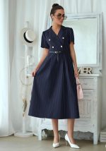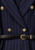 Κομψό midi φόρεμα Gert σε navy απόχρωση με διακριτική ριγέ υφή, σχεδιασμένο σε tailored γραμμή που αναδεικνύει τη μέση και δημιουργεί θηλυκή σιλουέτα. Το σχέδιο εμπνέεται από το κλασικό blazer style, με διπλή σειρά διακοσμητικών χρυσών κουμπιών που προσδίδουν sophisticated χαρακτήρα. Η midi φούστα ανοίγει απαλά από τη μέση, χαρίζοντας κομψή κίνηση και ισορροπημένη εφαρμογή. Συνοδεύεται από μαύρη ζώνη που τονίζει τη μέση και ολοκληρώνει το polished look. Το ύφασμα με κάθετες λεπτές ρίγες επιμηκύνει οπτικά τη σιλουέτα, καθιστώντας το φόρεμα ιδανικό για επαγγελματικές εμφανίσεις αλλά και κομψά daytime events. Ιδανική επιλογή για office chic εμφανίσεις, επαγγελματικά meetings ή smart casual σύνολα με minimal αισθητική.