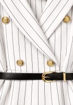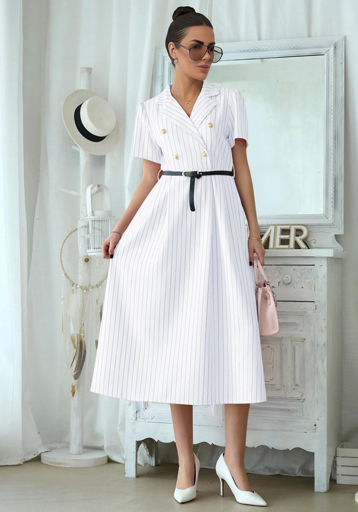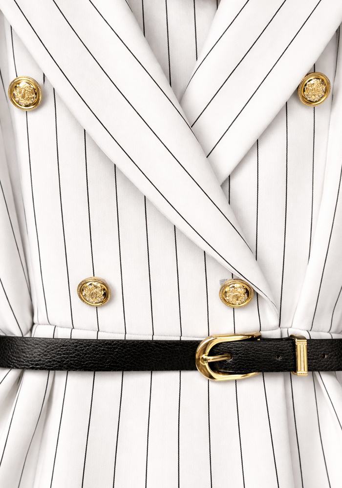 Κομψό midi φόρεμα Gert σε λευκό χρώμα με διακριτική ριγέ υφή, σχεδιασμένο σε tailored γραμμή που αναδεικνύει τη μέση και δημιουργεί θηλυκή σιλουέτα. Το σχέδιο εμπνέεται από το κλασικό blazer style, με διπλή σειρά διακοσμητικών χρυσών κουμπιών που προσδίδουν sophisticated χαρακτήρα. Η midi φούστα ανοίγει απαλά από τη μέση, χαρίζοντας κομψή κίνηση και ισορροπημένη εφαρμογή. Συνοδεύεται από μαύρη ζώνη που τονίζει τη μέση και ολοκληρώνει το polished look. Το ύφασμα με κάθετες λεπτές ρίγες επιμηκύνει οπτικά τη σιλουέτα, καθιστώντας το φόρεμα ιδανικό για επαγγελματικές εμφανίσεις αλλά και κομψά daytime events. Ιδανική επιλογή για office chic εμφανίσεις, επαγγελματικά meetings ή smart casual σύνολα με minimal αισθητική.