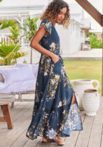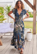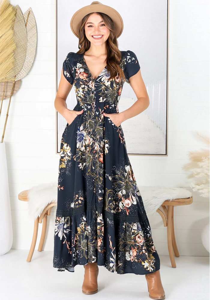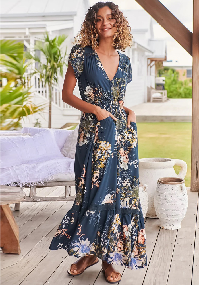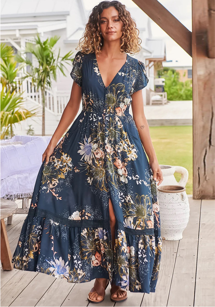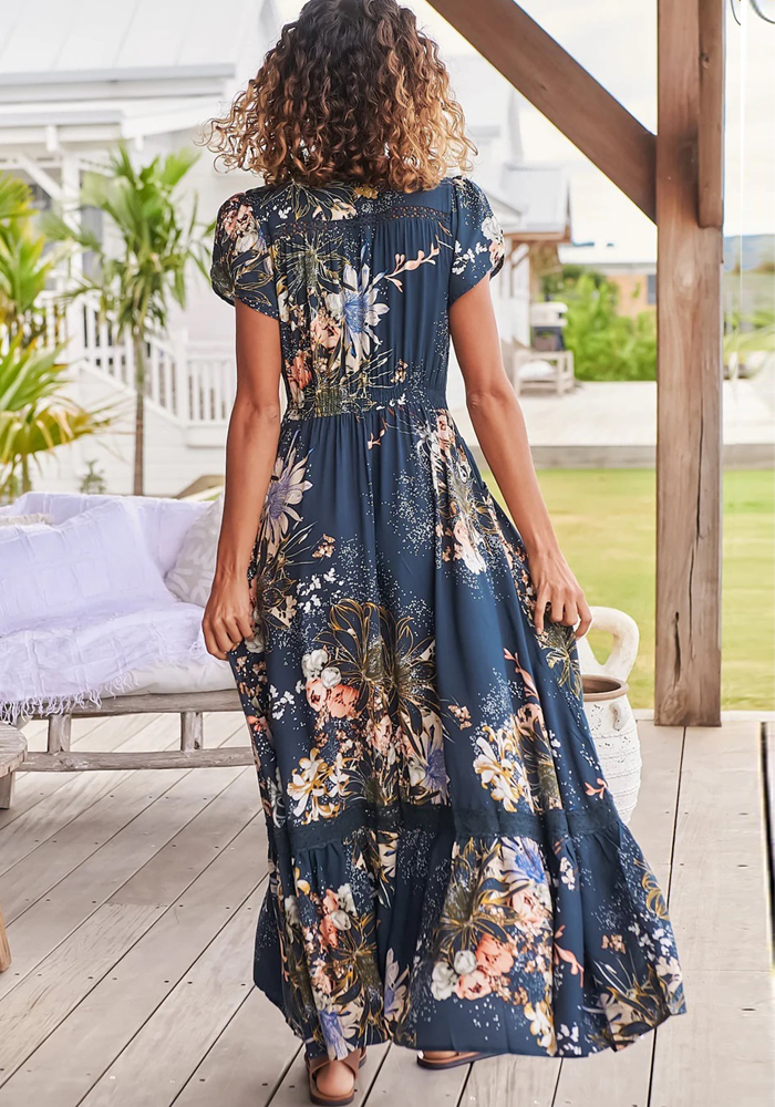 Bohemian chic, maxi φόρεμα από high quality viscose rayon ύφασμα με αέρινο πέσιμο σε floral print . Είναι σχεδιασμένο με V εμπρός,, πατιλέτα με κουμπάκια. Στη μέση έχει λάστιχο ”σφηκοφωλιά”για τέλειο fitting, στο κάτω τμήμα άνετη κλος γραμμή με τσέπες & gypsy στρίφωμα με φάσα crochet δαντέλας. Must have summer piece!