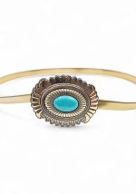 Εντυπωσιακή γυναικεία ζώνη Jewel σε χρυσό με μεταλλική αγκράφα τύπου western και διακοσμητική τιρκουάζ πέτρα στο κέντρο, σχεδιασμένη για να λειτουργεί ως statement αξεσουάρ σε κάθε εμφάνιση. Το λεπτό μεταλλικό σώμα σε χρυσή απόχρωση αγκαλιάζει κομψά τη μέση, ενώ το ανάγλυφο vintage μοτίβο της αγκράφας προσδίδει boho και ethnic χαρακτήρα. Ιδανική για styling πάνω από φορέματα, καφτάνια, πουκάμισα ή ψηλόμεσα σύνολα, αναβαθμίζει άμεσα το outfit και προσφέρει έντονη αισθητική ταυτότητα. Ένα fashion accessory που συνδυάζει διαχρονικό design και σύγχρονο styling.