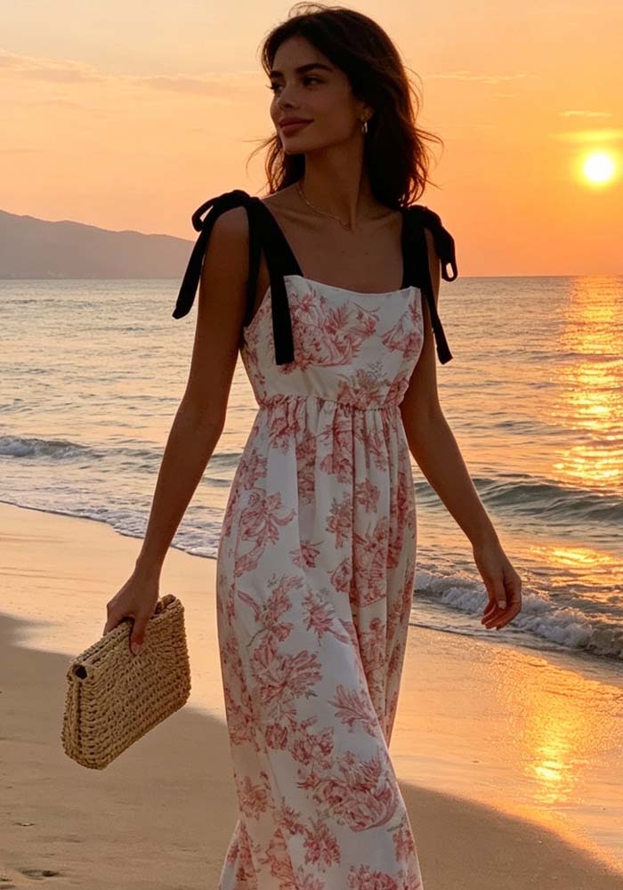 Ρομαντικό maxi φόρεμα Porcelain σε λευκή βάση με ροζ floral μοτίβο, ιδανικό για καλοκαιρινές εμφανίσεις σε νησί ή ιδιαίτερες περιστάσεις. Διαθέτει ελαστική μέση που αγκαλιάζει το σώμα και τιράντες που δένουν στους ώμους, προσθέτοντας θηλυκή και παιχνιδιάρικη λεπτομέρεια. Η αέρινη γραμμή του χαρίζει κίνηση και άνεση, ενώ το print του δίνει elegant resort χαρακτήρα.