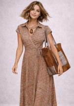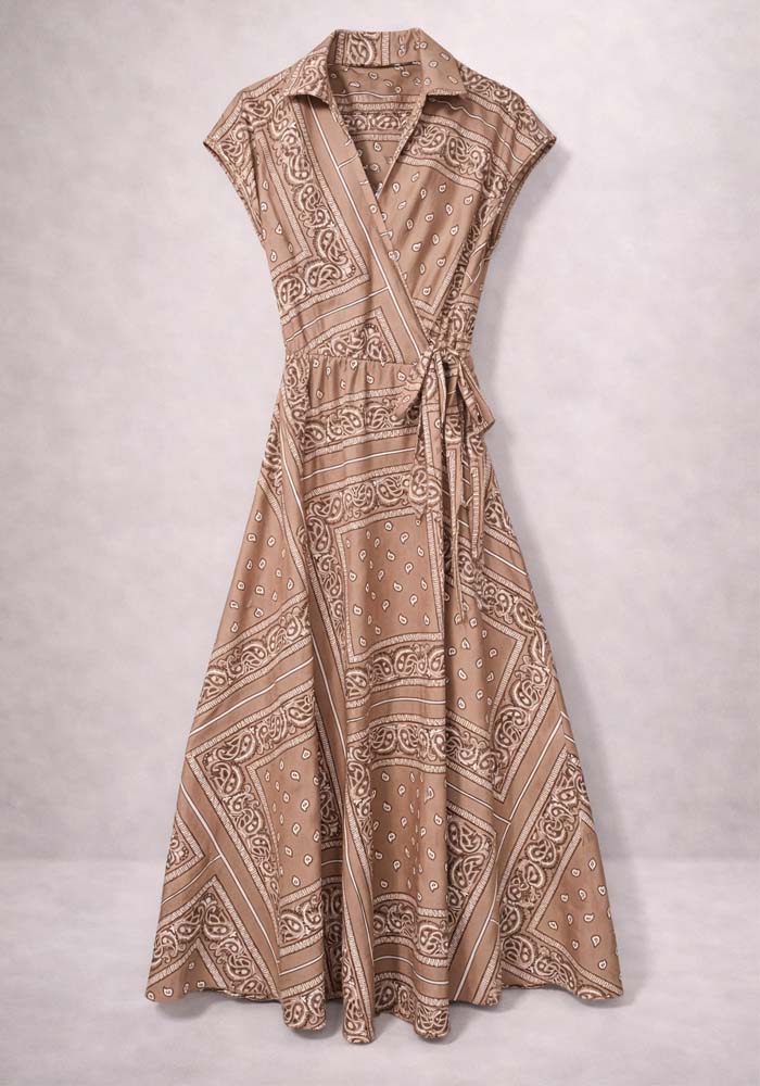 Midi wrap φόρεμα Paisley από 100% βαμβάκι, σχεδιασμένο σε κομψό paisley-inspired μοτίβο σε γήινες αποχρώσεις μπεζ. Το φυσικό cotton ύφασμα προσφέρει άνεση και διαπνοή, ιδανικό για καθημερινές αλλά και πιο προσεγμένες εμφανίσεις. Η κρουαζέ γραμμή αγκαλιάζει τη σιλουέτα, ενώ το δέσιμο στη μέση επιτρέπει προσαρμογή για τέλεια εφαρμογή. Ο γιακάς τύπου πουκαμίσου προσθέτει κομψότητα, ενώ τα κοντά μανίκια ενισχύουν τον relaxed χαρακτήρα του σχεδίου. Το μήκος 3/4 δημιουργεί ισορροπημένη γραμμή και καθιστά το φόρεμα ευέλικτο για όλες τις ώρες της ημέρας. Ένα διαχρονικό cotton φόρεμα που συνδυάζει άνεση, κομψότητα και πρακτικότητα.