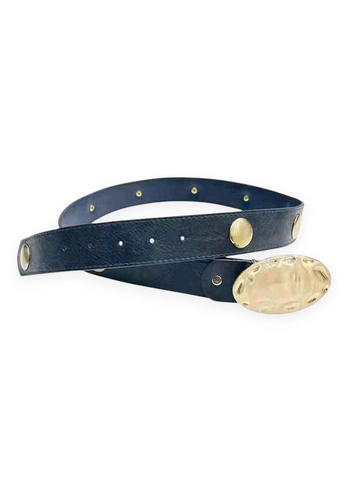 Γυναικεία δερματίνη ζώνη Lisa σε μπλε απόχρωση με διακριτικά μεταλλικά χρυσά στοιχεία και κεντρική οβάλ αγκράφα σε polished φινίρισμα. Ο καθαρός σχεδιασμός συνδυάζει minimal αισθητική με statement λεπτομέρειες, δημιουργώντας ένα κομμάτι που αναβαθμίζει άμεσα κάθε outfit. Τα στρογγυλά μεταλλικά διακοσμητικά κατά μήκος της ζώνης προσθέτουν μοντέρνο χαρακτήρα, ενώ η ρυθμιζόμενη εφαρμογή επιτρέπει άνετη και σταθερή προσαρμογή στη μέση ή στους γοφούς. Ιδανική για φορέματα, tailored παντελόνια, denim και oversized σακάκια.
