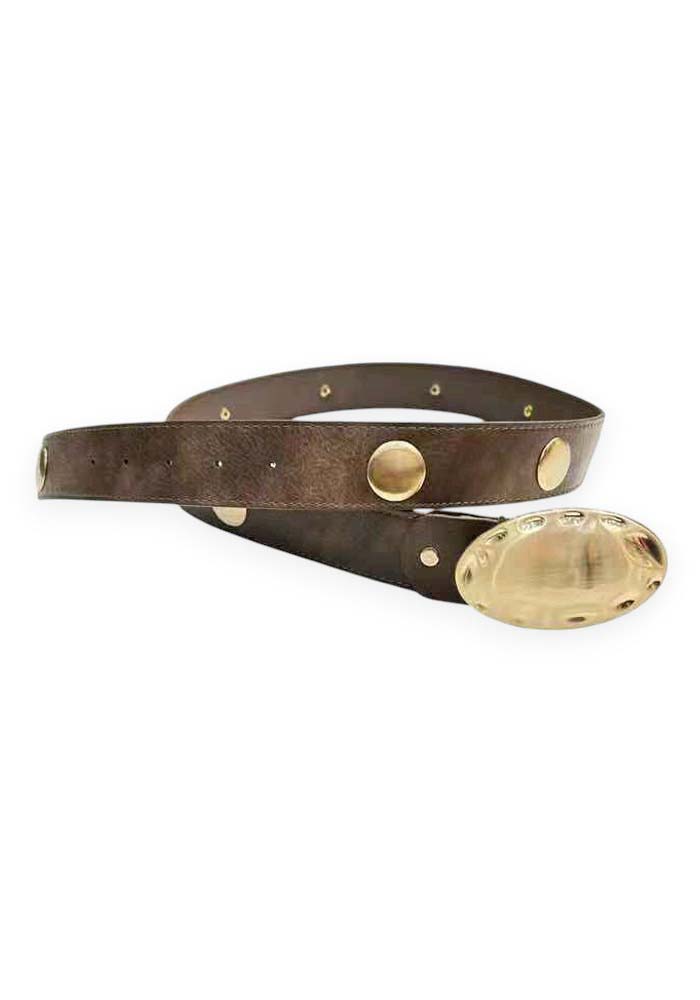 Γυναικεία δερματίνη ζώνη Lisa σε καφέ απόχρωση με διακριτικά μεταλλικά χρυσά στοιχεία και κεντρική οβάλ αγκράφα σε polished φινίρισμα. Ο καθαρός σχεδιασμός συνδυάζει minimal αισθητική με statement λεπτομέρειες, δημιουργώντας ένα κομμάτι που αναβαθμίζει άμεσα κάθε outfit. Τα στρογγυλά μεταλλικά διακοσμητικά κατά μήκος της ζώνης προσθέτουν μοντέρνο χαρακτήρα, ενώ η ρυθμιζόμενη εφαρμογή επιτρέπει άνετη και σταθερή προσαρμογή στη μέση ή στους γοφούς. Ιδανική για φορέματα, tailored παντελόνια, denim και oversized σακάκια.
