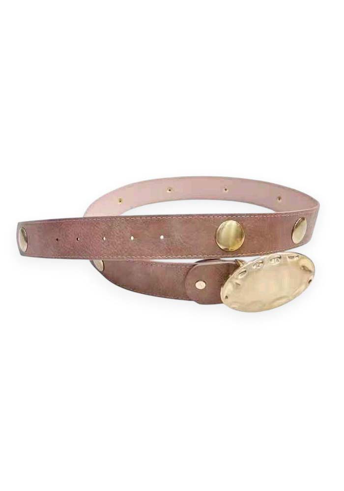 Γυναικεία δερματίνη ζώνη Lisa σε ροζ απόχρωση με διακριτικά μεταλλικά χρυσά στοιχεία και κεντρική οβάλ αγκράφα σε polished φινίρισμα. Ο καθαρός σχεδιασμός συνδυάζει minimal αισθητική με statement λεπτομέρειες, δημιουργώντας ένα κομμάτι που αναβαθμίζει άμεσα κάθε outfit. Τα στρογγυλά μεταλλικά διακοσμητικά κατά μήκος της ζώνης προσθέτουν μοντέρνο χαρακτήρα, ενώ η ρυθμιζόμενη εφαρμογή επιτρέπει άνετη και σταθερή προσαρμογή στη μέση ή στους γοφούς. Ιδανική για φορέματα, tailored παντελόνια, denim και oversized σακάκια.