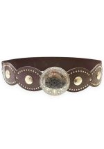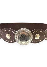 Statement δερματίνη ελαστική ζώνη Bonnie σε καφέ απόχρωση, σχεδιασμένη για να αναδεικνύει τη μέση και να ολοκληρώνει boho, western και chic εμφανίσεις. Το εντυπωσιακό μεταλλικό στοιχείο στο κέντρο, με ανάγλυφη διακόσμηση και ethnic χαρακτήρα, λειτουργεί ως βασικό design feature και προσδίδει έντονη προσωπικότητα στο styling. Οι στρογγυλές διακοσμητικές λεπτομέρειες κατά μήκος της ζώνης, σε συνδυασμό με τα μεταλλικά τρουκς, δημιουργούν ένα ισορροπημένο αποτέλεσμα μεταξύ ρομαντικού και δυναμικού ύφους. Η ελαστική κατασκευή εξασφαλίζει άνετη εφαρμογή και προσαρμογή σε διαφορετικούς σωματότυπους.