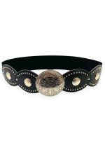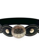 Statement δερματίνη ελαστική ζώνη Bonnie σε μαύρο χρώμα, σχεδιασμένη για να αναδεικνύει τη μέση και να ολοκληρώνει boho, western και chic εμφανίσεις. Το εντυπωσιακό μεταλλικό στοιχείο στο κέντρο, με ανάγλυφη διακόσμηση και ethnic χαρακτήρα, λειτουργεί ως βασικό design feature και προσδίδει έντονη προσωπικότητα στο styling. Οι στρογγυλές διακοσμητικές λεπτομέρειες κατά μήκος της ζώνης, σε συνδυασμό με τα μεταλλικά τρουκς, δημιουργούν ένα ισορροπημένο αποτέλεσμα μεταξύ ρομαντικού και δυναμικού ύφους. Η ελαστική κατασκευή εξασφαλίζει άνετη εφαρμογή και προσαρμογή σε διαφορετικούς σωματότυπους.