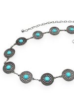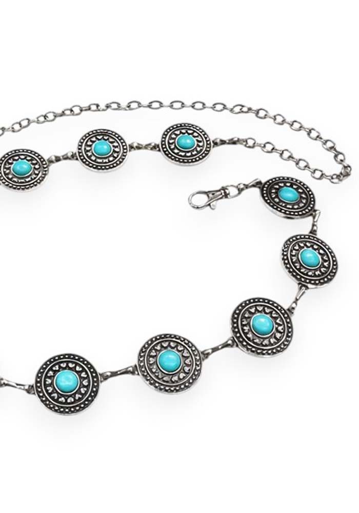 Statement γυναικεία ζώνη-αλυσίδα Jamie σε ασημί τόνο, διακοσμημένη με κυκλικά μεταλλικά μοτίβα και τυρκουάζ πέτρες στο κέντρο. Η ethnic αισθητική και οι vintage λεπτομέρειες δημιουργούν ένα δυναμικό boho αποτέλεσμα, ιδανικό για εμφανίσεις με χαρακτήρα. Η μεταλλική αλυσίδα επιτρέπει ρυθμιζόμενη εφαρμογή, προσφέροντας ευελιξία στη μέση ή στους γοφούς. Φοριέται άψογα πάνω από maxi φορέματα, κιμονό, total black looks ή denim outfits, λειτουργώντας ως κομβικό styling στοιχείο.