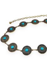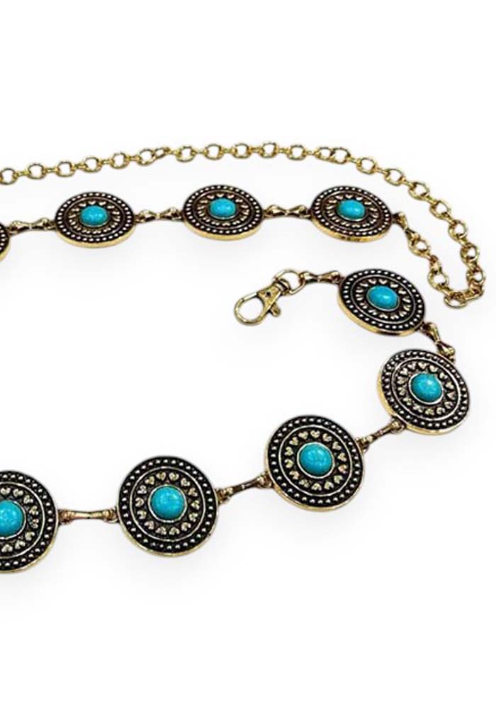 Statement γυναικεία ζώνη-αλυσίδα Jamie σε χρυσό τόνο, διακοσμημένη με κυκλικά μεταλλικά μοτίβα και τυρκουάζ πέτρες στο κέντρο. Η ethnic αισθητική και οι vintage λεπτομέρειες δημιουργούν ένα δυναμικό boho αποτέλεσμα, ιδανικό για εμφανίσεις με χαρακτήρα. Η μεταλλική αλυσίδα επιτρέπει ρυθμιζόμενη εφαρμογή, προσφέροντας ευελιξία στη μέση ή στους γοφούς. Φοριέται άψογα πάνω από maxi φορέματα, κιμονό, total black looks ή denim outfits, λειτουργώντας ως κομβικό styling στοιχείο.
