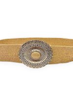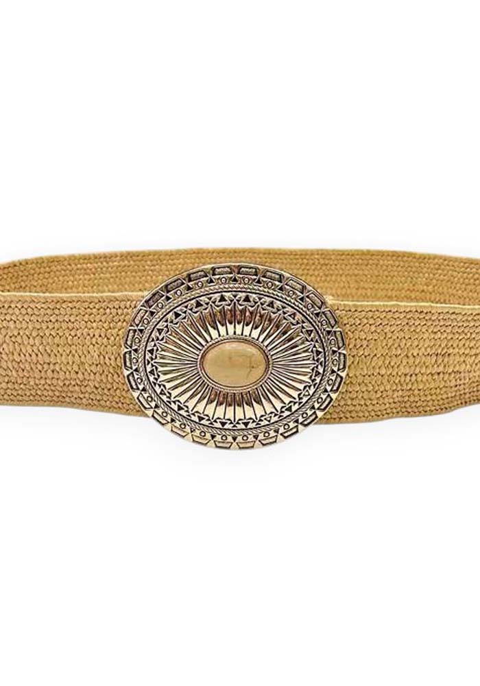 Ελαστική ψάθινη γυναικεία ζώνη Kimberly σε φυσική μπεζ απόχρωση με πλεκτή υφή, ιδανική για καλοκαιρινά και resort-inspired looks. Το κεντρικό μεταλλικό στοιχείο με ανάγλυφη ethnic αισθητική και γεωμετρικές λεπτομέρειες προσδίδει χαρακτήρα και boho ταυτότητα στο σύνολο. Η ελαστική κατασκευή εξασφαλίζει άνετη εφαρμογή και σταθερό κράτημα στη μέση, αναδεικνύοντας τη σιλουέτα χωρίς περιορισμό στην κίνηση. Συνδυάζεται άψογα με maxi φορέματα, λινά σύνολα, κιμονό και αέρινες μπλούζες, λειτουργώντας ως κομβικό styling στοιχείο.