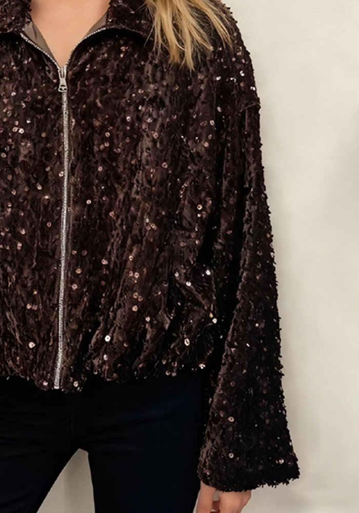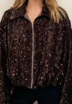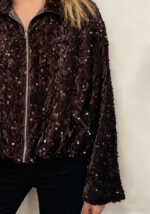 Το καφέ bomber σακάκι Dia είναι η απόλυτη πρόταση για glamorous εμφανίσεις με σύγχρονο χαρακτήρα. Διακοσμημένο με παγιέτες σε όλη την επιφάνεια, χαρίζει εντυπωσιακή λάμψη χωρίς να χάνει τη διακριτική του κομψότητα. Η μοντέρνα γραμμή bomber με φερμουάρ και ελαφρώς χαλαρή εφαρμογή το καθιστά ιδανικό τόσο για βραδινά looks όσο και για statement street outfits.