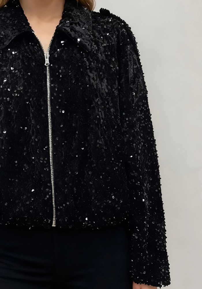 Το μαύρο bomber σακάκι Dia είναι η απόλυτη πρόταση για glamorous εμφανίσεις με σύγχρονο χαρακτήρα. Διακοσμημένο με παγιέτες σε όλη την επιφάνεια, χαρίζει εντυπωσιακή λάμψη χωρίς να χάνει τη διακριτική του κομψότητα. Η μοντέρνα γραμμή bomber με φερμουάρ και ελαφρώς χαλαρή εφαρμογή το καθιστά ιδανικό τόσο για βραδινά looks όσο και για statement street outfits.