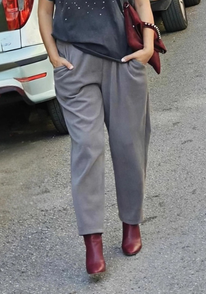 Το γκρι βελουτέ παντελόνι Jerry συνδυάζει το άνετο design με τη διακριτική κομψότητα. Κατασκευασμένο από μαλακό ύφασμα με υφή βελούδου, διαθέτει πλαϊνές τσέπες και λάστιχο στο πίσω μέρος της μέσης για τέλεια εφαρμογή και άνεση όλη μέρα. Η δερματίνη ζώνη σε καφέ απόχρωση τονίζει τη μέση και προσδίδει sophisticated χαρακτήρα στο look. Ιδανικό για επαγγελματικές εμφανίσεις, εξόδους ή casual chic συνδυασμούς με πουκάμισο, πουλόβερ ή t-shirt.