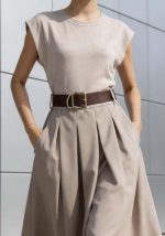 Κομψό maxi φόρεμα Doppio σε μπεζ απόχρωση με διπλή κατασκευή υφάσματος, σχεδιασμένο για άνεση στο επάνω μέρος και σταθερή δομή στη φούστα. Το ελαστικό επάνω μέρος εφαρμόζει άψογα στο σώμα προσφέροντας ελευθερία κίνησης και άνεση καθ’ όλη τη διάρκεια της ημέρας, ενώ το σταθερό ύφασμα στο κάτω μέρος χαρίζει κομψή πτώση και επαγγελματικό αποτέλεσμα στη σιλουέτα. Οι δομημένοι ώμοι ενισχύουν το μοντέρνο χαρακτήρα του φορέματος, ενώ η ζώνη στη μέση αναδεικνύει τη γραμμή της μέσης και δημιουργεί ισορροπημένο, δυναμικό look. Ιδανικό για business εμφανίσεις, city chic styling και after-office εξόδους.
