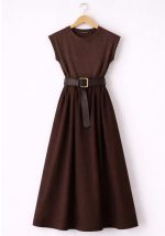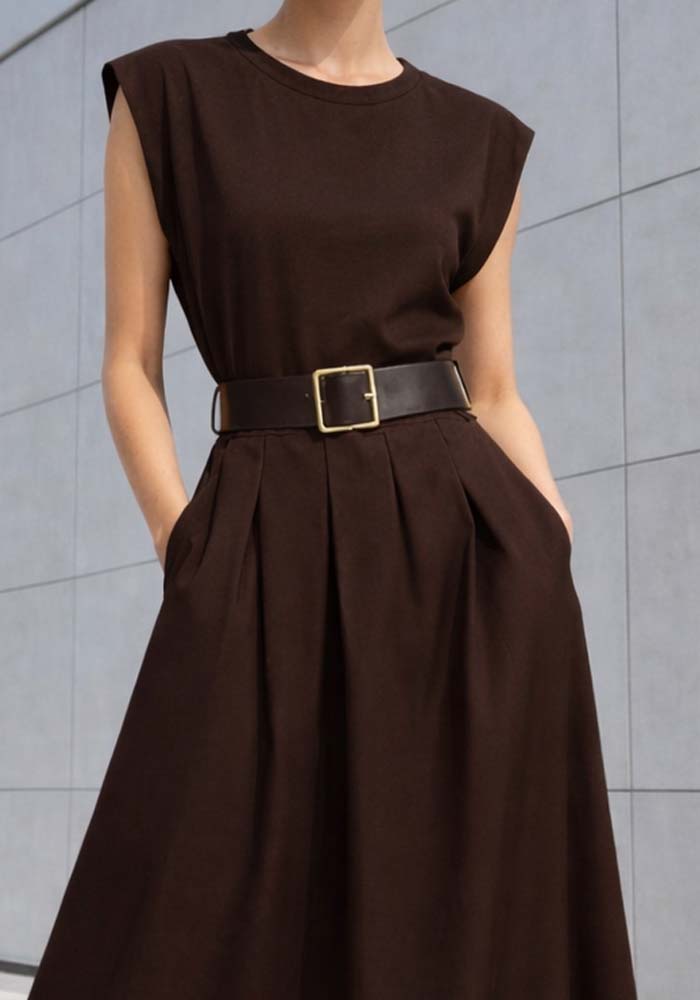 Κομψό maxi φόρεμα Doppio σε καφέ απόχρωση με διπλή κατασκευή υφάσματος, σχεδιασμένο για άνεση στο επάνω μέρος και σταθερή δομή στη φούστα. Το ελαστικό επάνω μέρος εφαρμόζει άψογα στο σώμα προσφέροντας ελευθερία κίνησης και άνεση καθ’ όλη τη διάρκεια της ημέρας, ενώ το σταθερό ύφασμα στο κάτω μέρος χαρίζει κομψή πτώση και επαγγελματικό αποτέλεσμα στη σιλουέτα. Οι δομημένοι ώμοι ενισχύουν το μοντέρνο χαρακτήρα του φορέματος, ενώ η ζώνη στη μέση αναδεικνύει τη γραμμή της μέσης και δημιουργεί ισορροπημένο, δυναμικό look. Ιδανικό για business εμφανίσεις, city chic styling και after-office εξόδους.