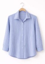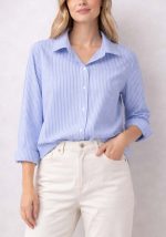 Κομψό γυναικείο πουκάμισο Stripes σε διαχρονικό σιέλ-λευκό ριγέ μοτίβο, σχεδιασμένο για άνεση και επαγγελματική εμφάνιση. Διαθέτει κλασικό γιακά, κουμπιά σε όλο το μήκος και μακριά μανίκια με μανσέτα, προσφέροντας ευελιξία για καθημερινή χρήση στο γραφείο ή smart-casual εμφανίσεις. Η άνετη γραμμή του το καθιστά ιδανική επιλογή για συνδυασμούς με παντελόνια και μέσα από πλεκτά, προσδίδοντας καθαρό και προσεγμένο στυλ.