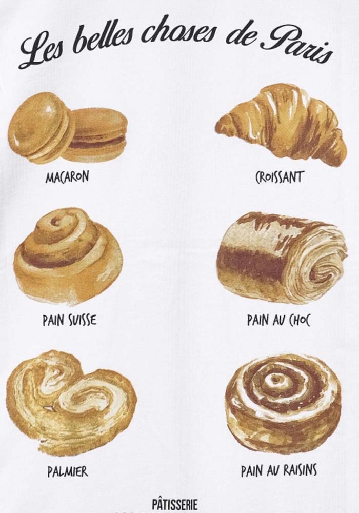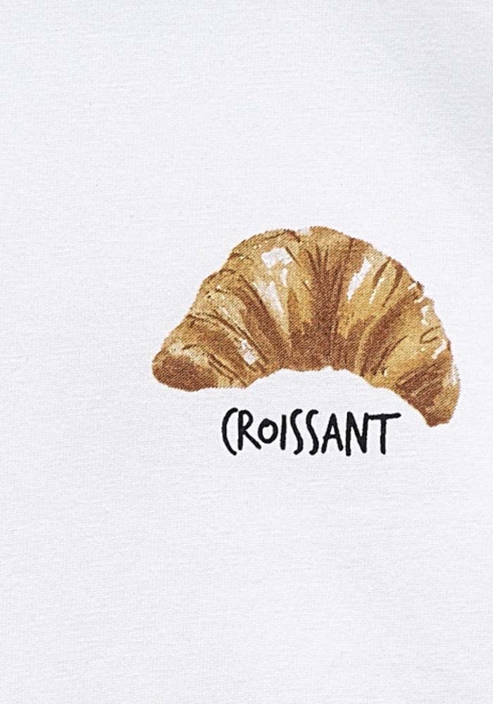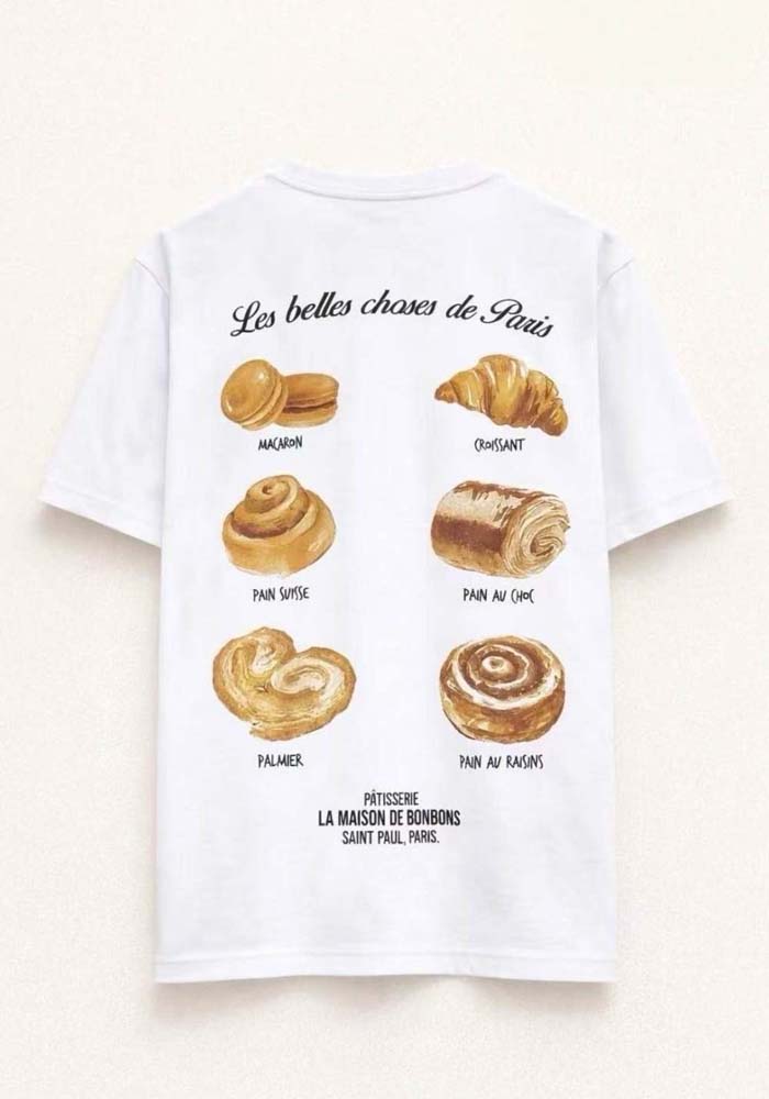 Λευκό t-shirt Croissant με minimal μπροστινό print croissant και εντυπωσιακό σχέδιο στην πλάτη εμπνευσμένο από γαλλική pâtisserie. Το back print με τα iconic γλυκά και τη φράση “Les belles choses de Paris” δίνει ένα ιδιαίτερο, playful και ταυτόχρονα chic χαρακτήρα. Ιδανικό για casual εμφανίσεις με fashion twist, συνδυάζει άνεση και σύγχρονο street style με parisian αισθητική.