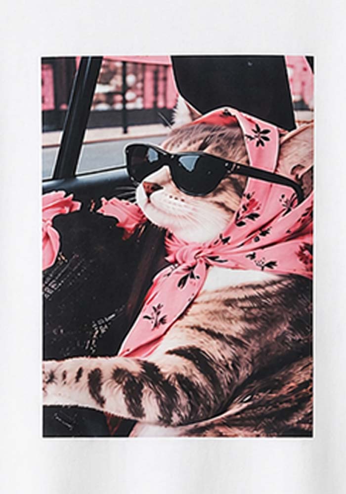 Λευκό t-shirt Vintage Cat με statement print γάτας με μαντήλι και γυαλιά ηλίου σε driving mood. Ένα fun και playful κομμάτι που φέρνει instantly viral αισθητική στο outfit σου. Ιδανικό για casual looks με χιούμορ και χαρακτήρα, χωρίς να χάνει το clean minimal base.