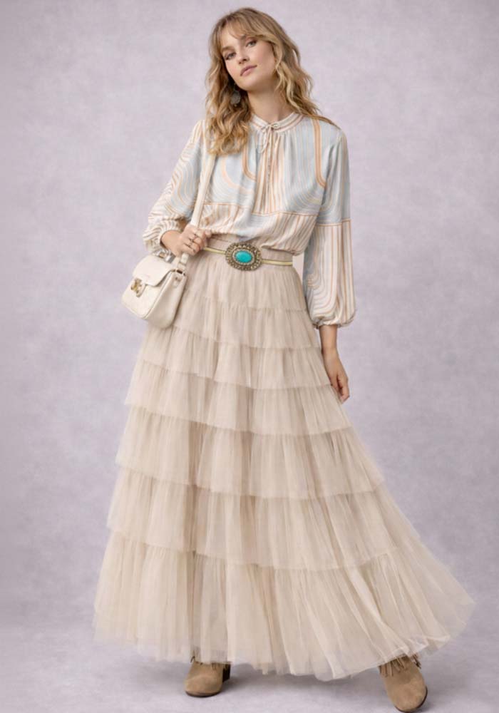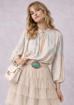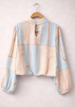 Κομψή cropped μπλούζα Quad από αέρινο chiffon ύφασμα με μοντέρνο abstract ριγέ μοτίβο σε απαλές σιέλ-σομόν αποχρώσεις. Διαθέτει όρθιο γιακά με διακριτικό άνοιγμα και κουμπί στο πίσω μέρος, προσφέροντας refined αισθητική και άνετη εφαρμογή. Τα balloon μανίκια με ελαστικό τελείωμα προσθέτουν θηλυκό όγκο και σύγχρονη γραμμή, ενώ το ελαστικό τελείωμα στη μέση εξασφαλίζει σταθερή εφαρμογή και κολακευτική σιλουέτα. Ιδανική επιλογή για day-to-night εμφανίσεις, συνδυάζεται εύκολα με ψηλόμεσες φούστες, tailored παντελόνια ή denim για elegant casual looks.