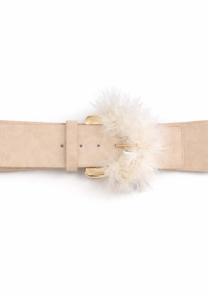 Εντυπωσιακή ελαστική ζώνη μέσης Charlotte σε nude απόχρωση με διακοσμητικό φτερό και χρυσή αγκράφα, σχεδιασμένη για να μετατρέπει κάθε outfit σε statement εμφάνιση. Ο συνδυασμός του μαλακού suede-look υλικού με το φτερό προσδίδει αίσθηση πολυτέλειας και fashion-forward χαρακτήρα. Η ελαστική βάση εξασφαλίζει άνετη εφαρμογή και σταθερό κράτημα στη μέση, ενώ το διακοσμητικό στοιχείο στο κέντρο προσθέτει μοναδικότητα και haute-inspired αισθητική. Ιδανική για φορέματα, boho σύνολα, cocktail εμφανίσεις και special occasion looks.