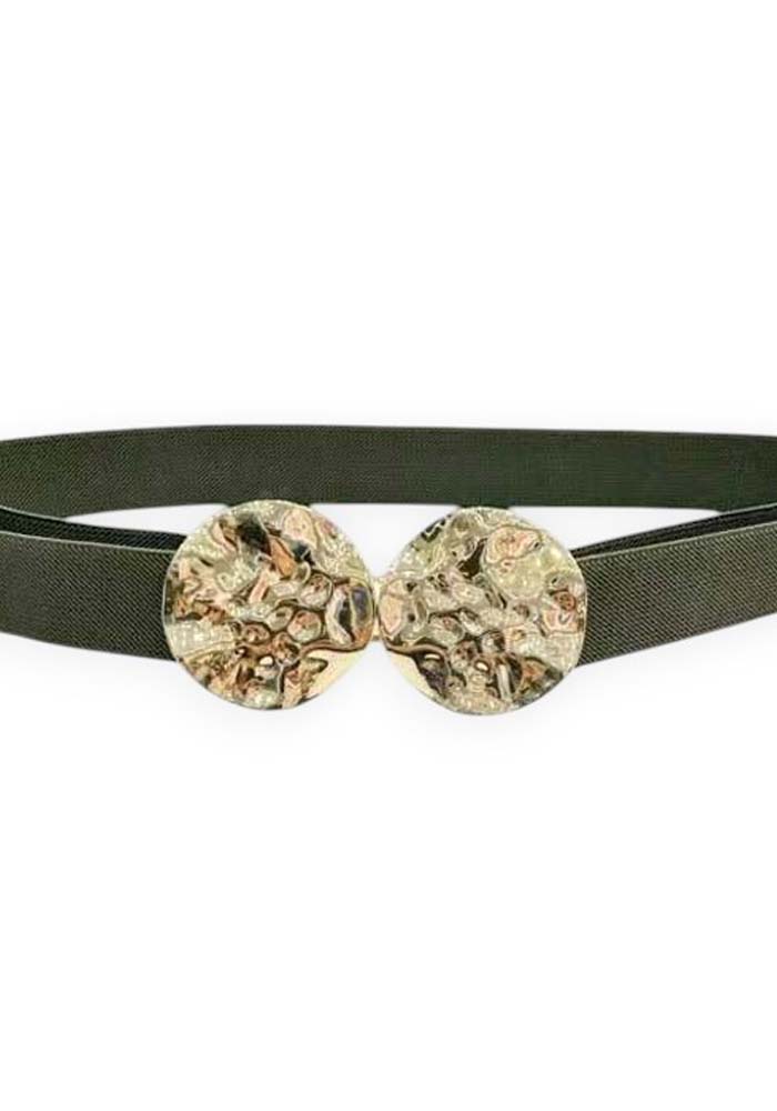 Σύγχρονη ελαστική ζώνη Goldie σε χακί απόχρωση, σχεδιασμένη για να προσδίδει ένταση και refined χαρακτήρα σε κάθε σύνολο. Το κεντρικό διακοσμητικό στοιχείο με διπλή στρογγυλή μεταλλική αγκράφα σε χρυσό τόνο και ανάγλυφη textured επιφάνεια δημιουργεί ένα διακριτικό αλλά δυναμικό statement. Η ελαστική βάση προσφέρει άνετη και σταθερή εφαρμογή, αναδεικνύοντας τη μέση χωρίς να περιορίζει την κίνηση. Ιδανική επιλογή για φορέματα, σακάκια, jumpsuits και ψηλόμεσα bottoms, λειτουργεί ως κομβικό styling εργαλείο σε minimal, elegant και βραδινά looks.
