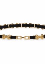 Ελαστική ζώνη Bow σε μαύρο χρώμα με διακοσμητικά μεταλλικά χρυσά στοιχεία σε σχέδιο φιόγκου. Το λεπτό design προσθέτει θηλυκή και κομψή πινελιά, ενώ η ελαστική κατασκευή εξασφαλίζει άνετη εφαρμογή και εύκολη προσαρμογή στη μέση. Ιδανική για φορέματα, πουκάμισα ή tunics, αναδεικνύει τη σιλουέτα χωρίς να βαραίνει το σύνολο. Το μεταλλικό κούμπωμα ολοκληρώνει την αισθητική με διακριτικό vintage χαρακτήρα.
