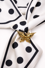 Κομψό κολιέ Trending 2 με υφασμάτινο φουλάρι σε εκρού απόχρωση με μαύρο πουά μοτίβο, σχεδιασμένο για να προσφέρει διαχρονική κομψότητα και feminine αισθητική. Το σχέδιο ολοκληρώνεται με μεταλλικό διακοσμητικό στοιχείο σε σχήμα πεταλούδας σε χρυσή απόχρωση, που προσθέτει διακριτική λάμψη και ιδιαίτερο χαρακτήρα. Η απαλή υφή του φουλαριού επιτρέπει άνετη εφαρμογή, ενώ η κλασική ασπρόμαυρη παλέτα καθιστά το αξεσουάρ ιδανικό για συνδυασμούς με minimal ή πιο elegant looks. Αποτελεί ιδανική επιλογή για αναβάθμιση καθημερινών outfits ή για ολοκλήρωση πιο κομψών εμφανίσεων.