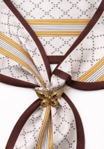 Κομψό κολιέ Trending 5 με υφασμάτινο φουλάρι σε εκρού βάση με καφέ περίγραμμα, διακοσμημένο με γεωμετρικό μοτίβο και διακριτικές ρίγες σε αποχρώσεις μουσταρδί και γκρι. Το κεντρικό στοιχείο είναι μεταλλική πεταλούδα σε χρυσή απόχρωση που προσδίδει elegant χαρακτήρα και refined αισθητική. Η απαλή υφή του υφάσματος επιτρέπει άνετη εφαρμογή, ενώ ο συνδυασμός γήινων αποχρώσεων το καθιστά εύκολο στο styling με neutral και sophisticated looks. Ιδανικό statement αξεσουάρ για καθημερινά outfits αλλά και πιο κομψές εμφανίσεις.