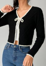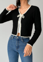 Η πλεκτή ζακέτα Ingrid σε μαύρο είναι το κομψό must-have κομμάτι της σεζόν. Με μαλακή υφή και ελαφριά πλέξη, συνδυάζει άνεση και διακριτική φινέτσα. Διαθέτει εκρού αντίθεση στα τελειώματα και δέσιμο με φιόγκο στο στήθος, δημιουργώντας έναν minimal αλλά θηλυκό συνδυασμό.Ιδανική για layering πάνω από crop top, πουκάμισα ή φορέματα, η Ingrid ζακέτα προσθέτει ένα διακριτικό touch γαλλικής κομψότητας σε κάθε outfit.