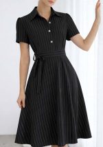 Midi φόρεμα Dorothy σε μαύρο χρώμα με λεπτές κάθετες ρίγες, σχεδιασμένο για κομψές και σύγχρονες εμφανίσεις. Η καθαρή γραμμή του και η δομημένη εφαρμογή στο επάνω μέρος δημιουργούν ισορροπημένη σιλουέτα, ενώ η ελαφρώς ανοιχτή φούστα προσφέρει φυσική κίνηση. Διαθέτει κλασικό γιακά που προσδίδει tailored χαρακτήρα, διακοσμητικά χρυσά κουμπιά στο μπροστινό μέρος και αποσπώμενη υφασμάτινη ζώνη που τονίζει τη μέση. Το ύφασμα έχει απαλή υφή και σταθερή πτώση, καθιστώντας το ιδανικό για office looks, business casual σύνολα αλλά και chic daytime εμφανίσεις.