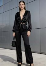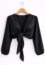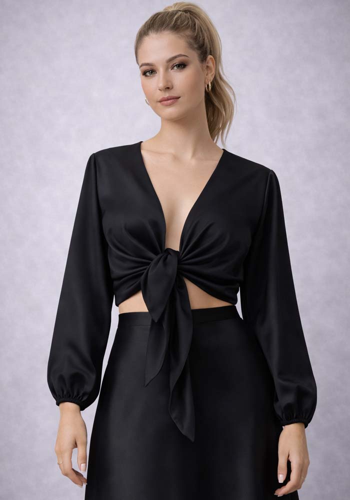 Κομψό σατέν μπολερό Jojo σε μαύρο, σχεδιασμένο για να ολοκληρώνει elegant και βραδινά σύνολα με fashion-forward αισθητική. Το βαθύ V άνοιγμα και το μπροστινό δέσιμο δημιουργούν θηλυκή γραμμή, ενώ τα μακριά μανίκια με ελαστικό τελείωμα εξασφαλίζουν άνεση και σωστή εφαρμογή. Η μεταξένια υφή του σατέν προσδίδει premium αίσθηση και καθιστά το μπολερό ιδανική επιλογή για φορέματα, strapless looks, τούλινες φούστες και cocktail εμφανίσεις. Ένα statement layering piece που αναβαθμίζει άμεσα κάθε outfit.