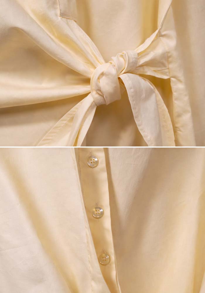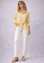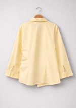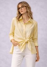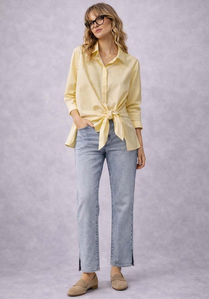 Κομψό πουκάμισο Japan σε απαλή κίτρινη απόχρωση, σχεδιασμένο με asymmetrical wrap λεπτομέρεια που δένει στο πλάι, δημιουργώντας μία σύγχρονη και θηλυκή σιλουέτα. Το διακριτικό δέσιμο στη μέση επιτρέπει προσαρμογή της εφαρμογής, αναδεικνύοντας τη γραμμή του σώματος με φυσικό και κομψό τρόπο. Το ύφασμα είναι ελαφρύ και ευχάριστο στην αφή, ιδανικό για καθημερινή χρήση αλλά και για πιο προσεγμένα looks γραφείου ή εξόδου. Ο κλασικός γιακάς και η καθαρή γραμμή ισορροπούν το μοντέρνο design, καθιστώντας το ένα ευέλικτο κομμάτι για capsule wardrobe.