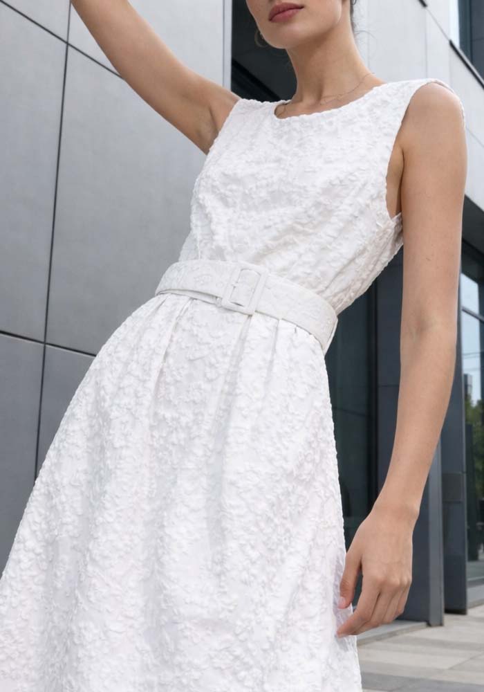 Κομψό midi φόρεμα Lucy σε λευκό χρώμα, κατασκευασμένο από ανάγλυφο μπροκάρ ύφασμα που προσφέρει πολυτελή αίσθηση και διακριτική λάμψη. Η αμάνικη γραμμή με στρογγυλή λαιμόκοψη δημιουργεί καθαρή, minimal αισθητική, ενώ η ενσωματωμένη ζώνη στη μέση τονίζει τη σιλουέτα και εξασφαλίζει άριστη εφαρμογή. Η άνετη κλος γραμμή και το midi μήκος το καθιστούν ιδανική επιλογή για επίσημες περιστάσεις, καλοκαιρινές εκδηλώσεις, γάμους, βαπτίσεις ή chic daytime εμφανίσεις. Ένα διαχρονικό κομμάτι που συνδυάζει κομψότητα, άνεση και σύγχρονο design.