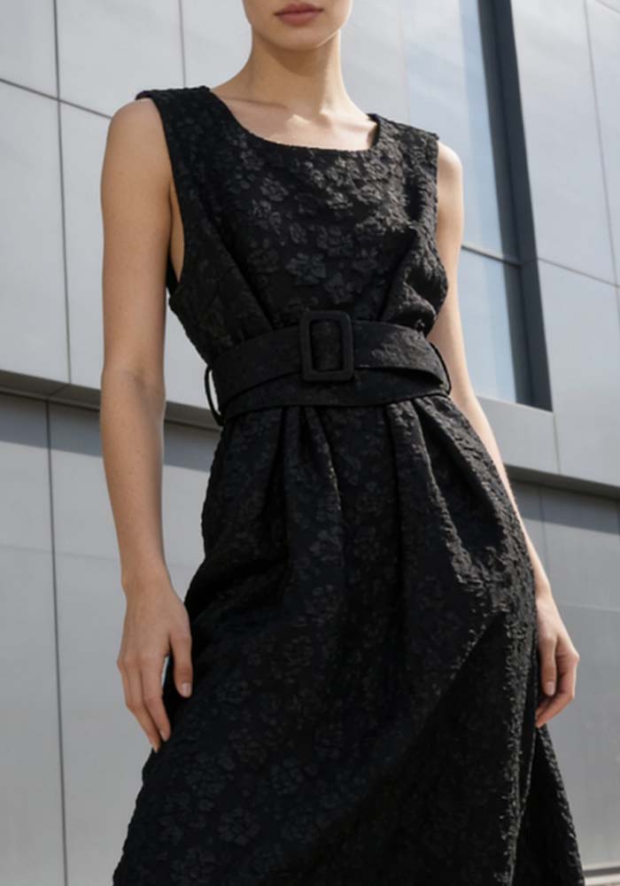 Κομψό midi φόρεμα Lucy σε μαύρο χρώμα, κατασκευασμένο από ανάγλυφο μπροκάρ ύφασμα που προσφέρει πολυτελή αίσθηση και διακριτική λάμψη. Η αμάνικη γραμμή με στρογγυλή λαιμόκοψη δημιουργεί καθαρή, minimal αισθητική, ενώ η ενσωματωμένη ζώνη στη μέση τονίζει τη σιλουέτα και εξασφαλίζει άριστη εφαρμογή. Η άνετη κλος γραμμή και το midi μήκος το καθιστούν ιδανική επιλογή για επίσημες περιστάσεις, καλοκαιρινές εκδηλώσεις, γάμους, βαπτίσεις ή chic daytime εμφανίσεις. Ένα διαχρονικό κομμάτι που συνδυάζει κομψότητα, άνεση και σύγχρονο design.
