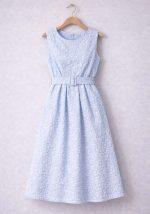 Κομψό midi φόρεμα Lucy σε σιέλ απόχρωση, κατασκευασμένο από ανάγλυφο μπροκάρ ύφασμα που προσφέρει πολυτελή αίσθηση και διακριτική λάμψη. Η αμάνικη γραμμή με στρογγυλή λαιμόκοψη δημιουργεί καθαρή, minimal αισθητική, ενώ η ενσωματωμένη ζώνη στη μέση τονίζει τη σιλουέτα και εξασφαλίζει άριστη εφαρμογή. Η άνετη κλος γραμμή και το midi μήκος το καθιστούν ιδανική επιλογή για επίσημες περιστάσεις, καλοκαιρινές εκδηλώσεις, γάμους, βαπτίσεις ή chic daytime εμφανίσεις. Ένα διαχρονικό κομμάτι που συνδυάζει κομψότητα, άνεση και σύγχρονο design.