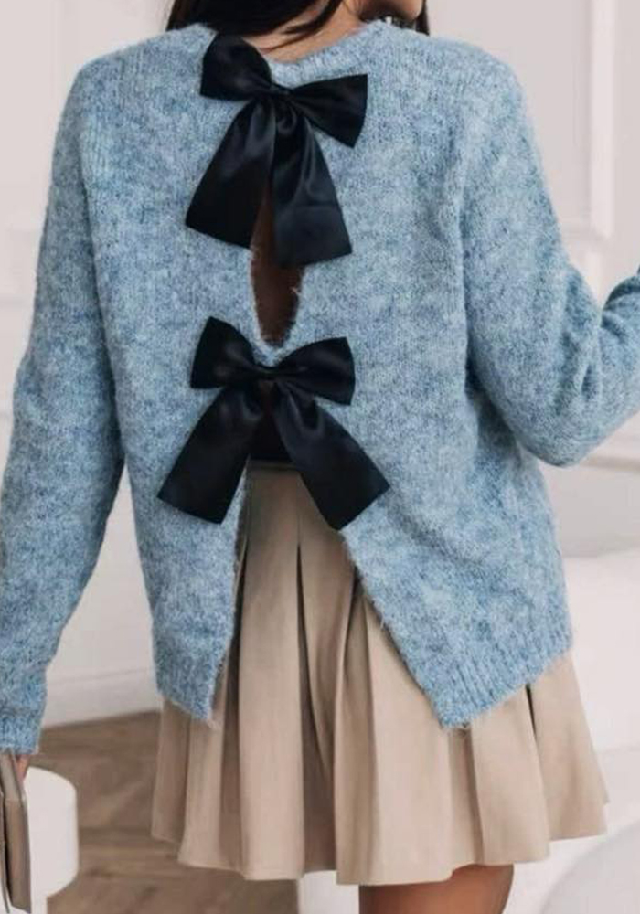 Η πλεκτή μπλούζα Bow σιέλ είναι ο ορισμός του ρομαντικού cozy chic στυλ. Σε παστέλ σιέλ χρώμα με αφράτη υφή, προσφέρει ζεστασιά και απαλή αίσθηση στο δέρμα, ενώ το εντυπωσιακό άνοιγμα στην πλάτη με δύο μαύρους σατέν φιόγκους προσδίδει ένα απρόσμενα θηλυκό twist. Η χαλαρή γραμμή της την καθιστά ιδανική για καθημερινές αλλά και πιο ιδιαίτερες εμφανίσεις — συνδυάζεται τέλεια με mini ή midi φούστες, jeans και suede boots.
