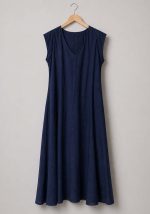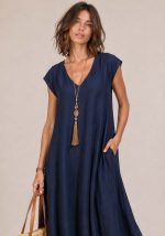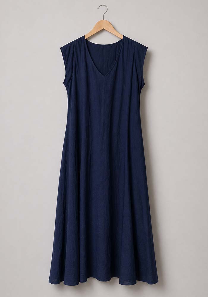Αέρινο maxi φόρεμα Dido σε μπλε navy απόχρωση με minimal αισθητική και χαλαρή γραμμή που αγκαλιάζει το σώμα χωρίς να το πιέζει. Διαθέτει V λαιμόκοψη και πρακτικές πλαϊνές τσέπες, συνδυάζοντας άνεση και στιλ για καθημερινές εμφανίσεις. Το βισκόζ ύφασμά του έχει φυσική υφή και ελαφριά κίνηση, ιδανικό για all-day wear.