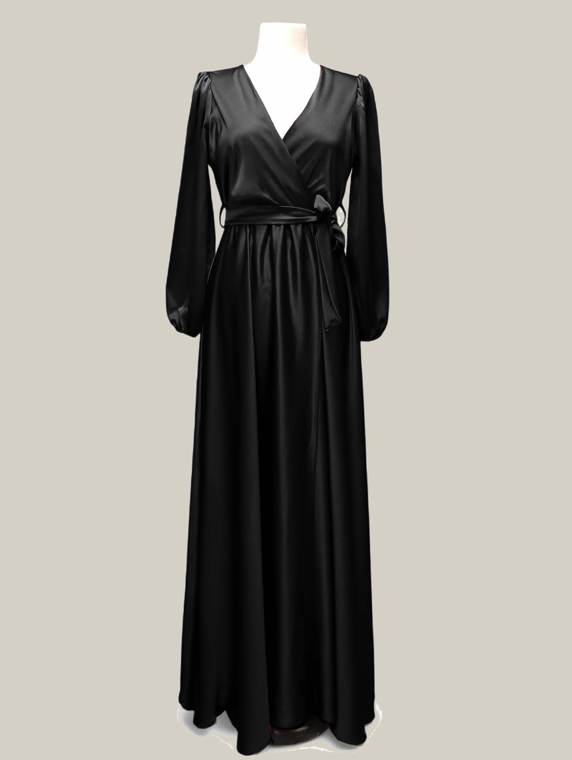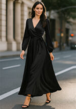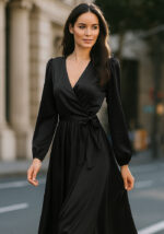 Το φόρεμα Satin Wrap σε μαύρο ενσαρκώνει την κομψότητα και τη θηλυκότητα σε κάθε του λεπτομέρεια. Κατασκευασμένο από υψηλής ποιότητας σατέν ύφασμα, διαθέτει εντυπωσιακή σταυρωτή λαιμόκοψη, δέσιμο στη μέση που αναδεικνύει τη σιλουέτα και μακριά balloon μανίκια για extra sophisticated ύφος. Η ρευστή του γραμμή δημιουργεί elegant κίνηση, ιδανική για επίσημα events, γάμους ή βραδινές εκδηλώσεις.