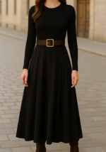 Το μαύρο φόρεμα Dual-Tone συνδυάζει minimal γραμμή με διαχρονική κομψότητα. Διαθέτει πλεκτό επάνω μέρος που αγκαλιάζει διακριτικά το σώμα και maxi φούστα με πιέτες και τσέπες στο πλάι, δημιουργώντας μία άψογη σιλουέτα. Η ζώνη σε σκούρο καφέ με χρυσή αγκράφα τονίζει τη μέση και προσθέτει sophisticated αντίθεση.