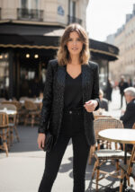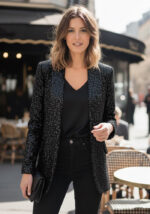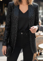 Το σακάκι Opera είναι το απόλυτο κομμάτι που συνδυάζει διαχρονική κομψότητα και μοντέρνο glam. Κατασκευασμένο από ύφασμα με διακριτικές παγιέτες που αντανακλούν το φως με εκλεπτυσμένο τρόπο, χαρίζει άμεση λάμψη σε κάθε εμφάνιση χωρίς υπερβολές. Η καθαρή γραμμή και η ελαφρώς μεσάτη εφαρμογή το καθιστούν ιδανικό για business events, βραδινές εξόδους ή κομψές εμφανίσεις πόλης. Συνδυάζεται άψογα με total black outfit ή μεταλλικά αξεσουάρ, αναδεικνύοντας ένα Parisian chic στυλ που ξεχωρίζει.