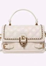 Κομψή γυναικεία τσάντα Jerome ώμου και χιαστί με καπιτονέ υφή σε λευκό χρώμα, σχεδιασμένη για elegant και σύγχρονα looks. Διαθέτει μεταλλικό κούμπωμα με διακοσμητικό μονόγραμμα και λεπτομέρειες αλυσίδας σε χρυσό τόνο που προσδίδουν πολυτελή χαρακτήρα. Η δομημένη γραμμή της προσφέρει σταθερό σχήμα και άνετη χωρητικότητα για καθημερινή χρήση, ενώ το επάνω χερούλι και το αποσπώμενο λουράκι επιτρέπουν ευέλικτο styling από day έως βραδινές εμφανίσεις. Ιδανική επιλογή για casual chic, office looks αλλά και βραδινά outfits.