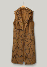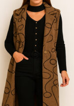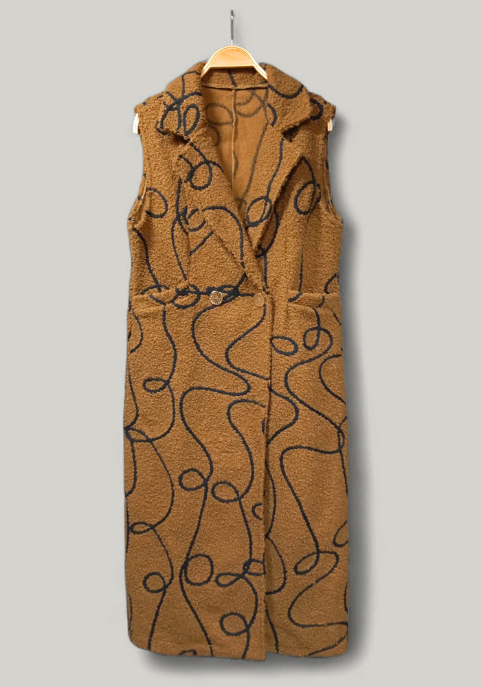Το μακρύ γιλέκο Gordon σε καμηλό με μαύρο σχέδιο αποτελεί την ιδανική επιλογή για layering με κομψότητα και χαρακτήρα. Η ζεστή υφή του προσφέρει άνεση και στυλ, ενώ το ιδιαίτερο print του προσθέτει statement πινελιά σε κάθε outfit. Διαθέτει μεσάτη γραμμή, μάκρος ως το γόνατο, κλασικό γιακά και χρυσά κουμπιά μπροστά για σταθερό κλείσιμο.