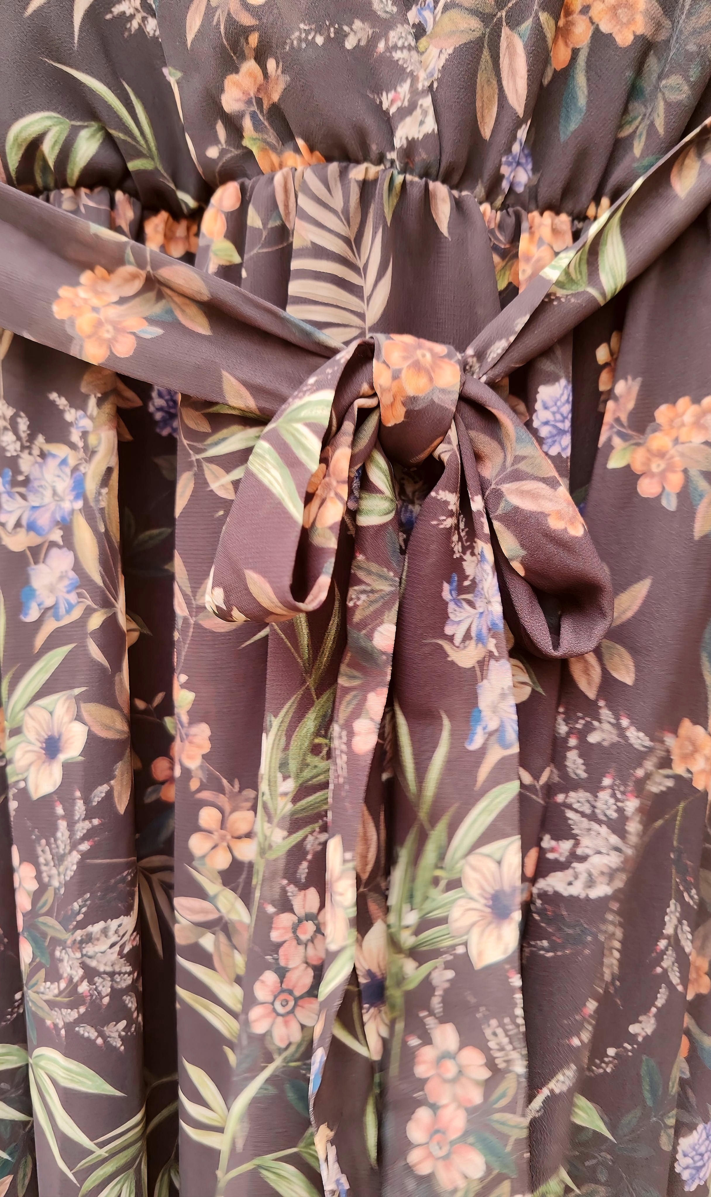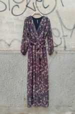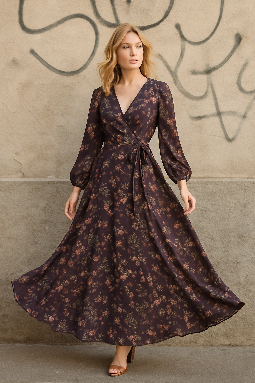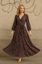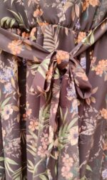 Αναβαθμίστε το στυλ σας με αυτό το κομψό μακρύ φόρεμα σε καφέ απόχρωση με φίνο floral μοτίβο. Το κρουαζέ κόψιμο προσφέρει θηλυκή γραμμή και προσαρμόζεται εύκολα στο σώμα χάρη στη ζώνη που τονίζει τη μέση. Τα μακριά μανίκια με ελαστικό τελείωμα προσθέτουν κίνηση και άνεση, καθιστώντας το ιδανικό για εκδηλώσεις, καλέσματα ή την καθημερινή σας chic εμφάνιση.