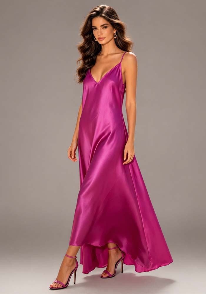 Μακρύ σατέν φόρεμα Gaia σε έντονη fuchsia απόχρωση, με λεπτές τιράντες και κομψή V λαιμόκοψη. Η ρευστή του γραμμή αγκαλιάζει το σώμα και δημιουργεί φυσική κίνηση σε κάθε βήμα, προσφέροντας ένα εντυπωσιακό και θηλυκό αποτέλεσμα. Ιδανικό για γάμο, βάπτιση ή βραδινές εμφανίσεις που θέλουν ένταση στο χρώμα και minimal κομψότητα.