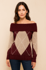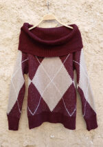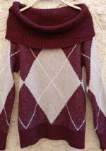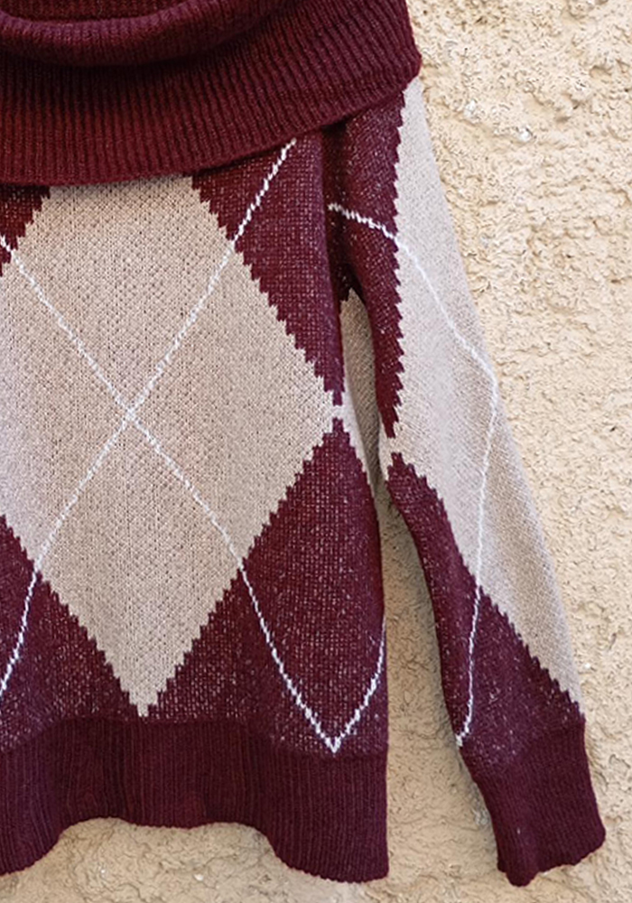 Ηπλεκτή μπλούζα Oxford σε μπορντώ συνδυάζει κλασικό μοτίβο και σύγχρονη κομψότητα. Με μοτίβο ρόμβων (argyle) σε αποχρώσεις μπορντώ και μπεζ, αυτό το πλεκτό είναι ιδανικό για cozy εμφανίσεις με διαχρονικό χαρακτήρα. Η φαρδιά ριχτή λαιμόκοψη μπορεί να φορεθεί είτε έξω από τον ώμο είτε κλασικά, προσφέροντας ευελιξία στο styling. Άνετο, μαλακό και ευκολοφόρετο, ταιριάζει τέλεια με τζιν, παντελόνια ή φούστες για ένα σοφιστικέ καθημερινό look.